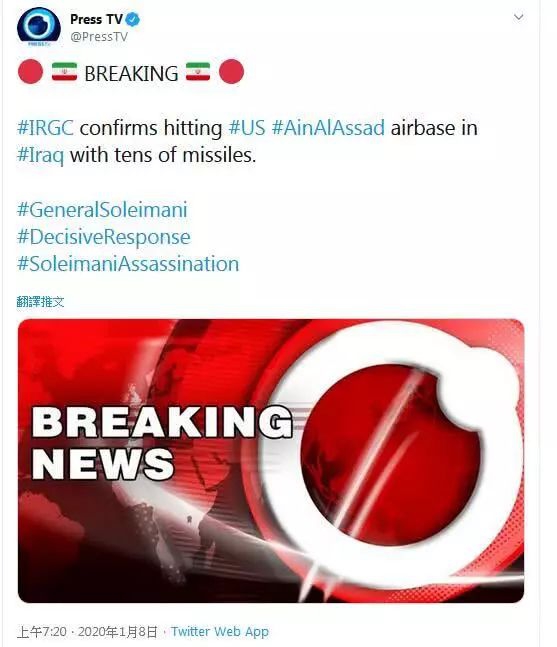 伊朗伊斯兰革命卫队发表声明说,“周三凌晨,在烈士苏莱马尼行动中,数十枚地对地导弹向美军基地发射,成功地砸向阿萨德基地。”
