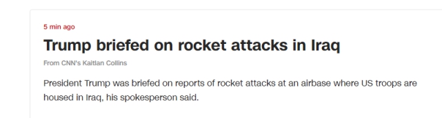 CNN援引白宫新闻秘书斯蒂芬妮·格里沙姆消息称,特朗普已经听取了有关美军驻伊拉克空军基地发生火箭弹袭击的报道的简报。“我们注意到有关美国在伊拉克设施遭到袭击的报道。总统已经得到了通报,正在密切关注情况,并与他的国家安全团队进行磋商,”斯蒂芬妮·格里沙姆说。