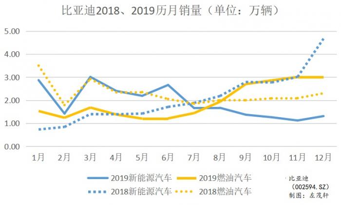 2018年7月,比亚迪的新能源汽车销量第一次超过了燃油车,开始实现传统汽车向新能源汽车的交替。最高点的2018年12月,比亚迪单月销量达到了4.67万辆。