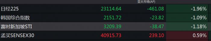 亚太股市方面,日经225、韩国综指、富时新加坡STI指数跌幅均超过1%,日经指数跌幅达1.96%。