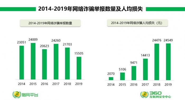 从2014年到2019年网络诈骗举报的数量和人均损失来看,这6年期间,尽管网络诈骗的举报数量有所起伏,但网络诈骗的人均损失数额却逐年提升。这从一定层面反映出,网络诈骗骗术愈发精准、专业,导致个体上当受骗的损失也越来越大。
