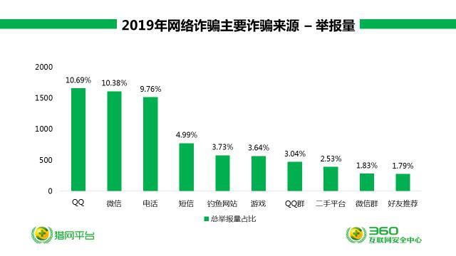 报告显示,QQ成为受害者接触诈骗者或诈骗信息的最主要途径,占总量的10.69%。其次为微信,占总量的10.38%。电话这种相对传统的工具,排在第三位,占总量的9.76%。可以看出,社交平台APP正取代电话成为诈骗者实施网络诈骗利用最多的工具或路径。