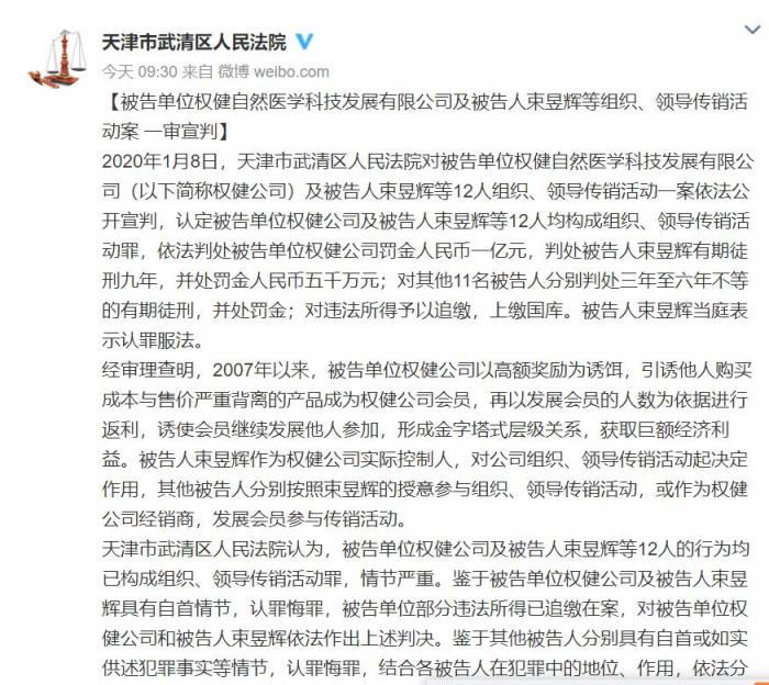 1月8日,天津市武清区人民法院对被告单位权健自然医学科技发展有限公司及被告人束昱辉等12人组织、领导传销活动一案依法公开宣判,认定被告单位权健公司及被告人束昱辉等12人均构成组织、领导传销活动罪,权健公司被判罚金人民币1亿元,束昱辉获刑9年,罚金5000万元,当庭表示认罪服法。