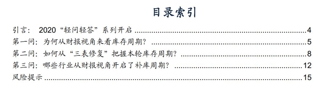 在本篇“轻问轻答”系列报告中,我们结合前期推荐思路,聚焦三个问题:第一问,为何从财报视角来看库存周期?第二问,如何从“三表修复”的财报视角来看本轮库存周期?第三问,哪些行业从财报视角已经开启了补库周期?又有哪些行业即将开启补库周期?