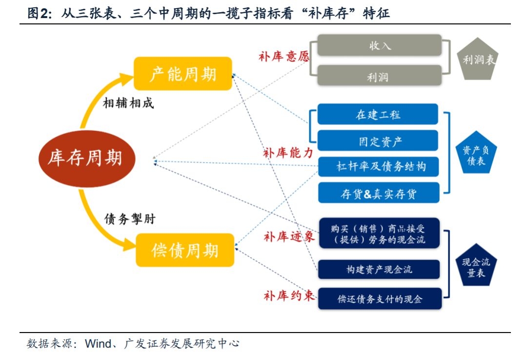 “三表修复”是企业开启“补库存”周期的前提。企业主动“补库存”需要兼具企业的“补库存”意愿+“补库存”能力。(1)利润表修复提升企业“补库存”意愿——企业的库存决策是宏观需求的滞后指标,而利润表的修复又能够直观反映宏观需求的变化,我们认为,利润表修复(即盈利底部回升)是驱动企业“补库存”意愿的先决条件;(2)现金流量表+资产负债表修复,决定企业“补库存”的能力——除了“补库存”的意愿外,“补库存”的能力同样重要。健康的现金流量表是“补库存”决策能够落地的重要保障;而平衡的资产负债表则是企业能否持续“补库存”的关键依据。只有在现金流量表和资产负债表同时修复的背景下,企业才有能力进行持续的“补库存”活动。