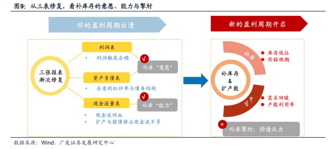 (1)三表修复。“补库存”的意愿(利润表)+能力(资产负债表、现金流量表),是驱动企业补库存的必要条件,其中,现金流量表修复(经营现金流改善)是企业“补库存”的基础。