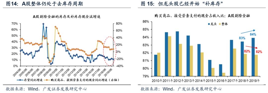 理论上来说,企业的库存周期可以分“三步走”:补库存现金流支出→原材料→产成品。但从上市公司的财报视角出发,企业的“存货”同时包含原材料+产成品。由此可见,补库存支出的现金流(购买商品、接受劳务支付的现金流)可以作为企业库存周期领先指标。(1)A股整体仍处于去库存周期中——19年3季报显示,无论是上市公司的存货同比增速,还是补库存现金流同比增速,都处于本轮库存周期的底部区域,仍未出现触底回升迹象。不过上市公司补库存现金流同比增速已经连续3个季度底部震荡,这说明目前A股正处于一轮库存周期的底部;(2)龙头股已经开始“补库存”——我们在11.04三季报分析《寄望龙头“牵引”,对冲民企“困局”》中指出,由于现金流充裕,龙头公司在库存同比低位,进一步靠去库“补血”的压力不大,反而已进入补库前夜。