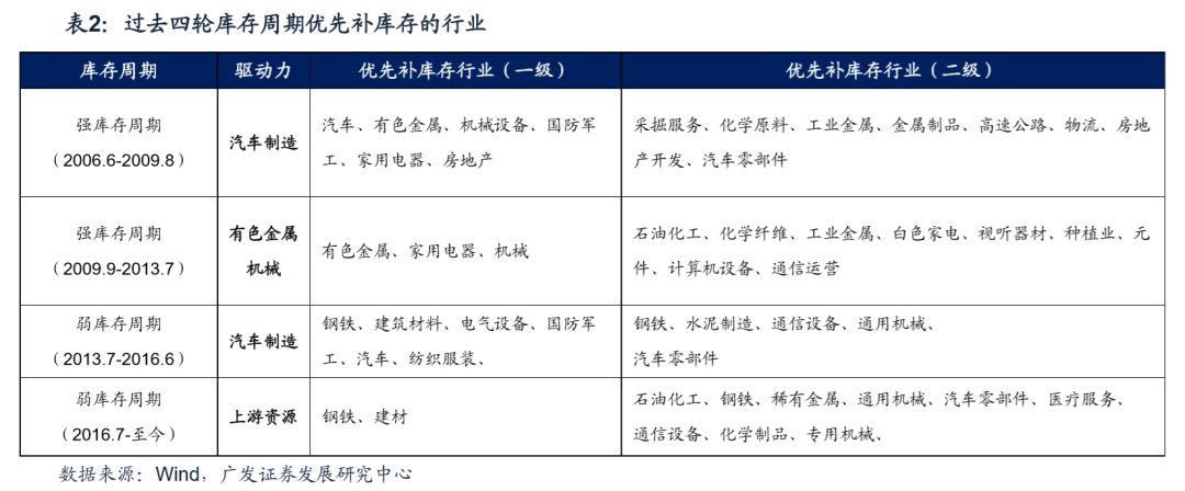 首先,过去四轮库存周期都有各自不同的驱动力,但率先开启补库存的行业能够在领先阶段取得显著的超额收益。