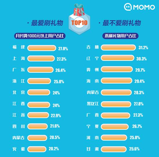 相反,北方内陆城市用户最不喜欢在直播中付费,全国范围内最不爱在直播中付费的TOP 10省市为吉林、辽宁、贵州、海南、内蒙古、黑龙江、广西、宁夏、河南、甘肃,不刷礼物的占比分别为:31.2%、30.3%、29.7%、29.4%、28.3%、27.8%、27.3%、26.7%、25.85、25.6%。