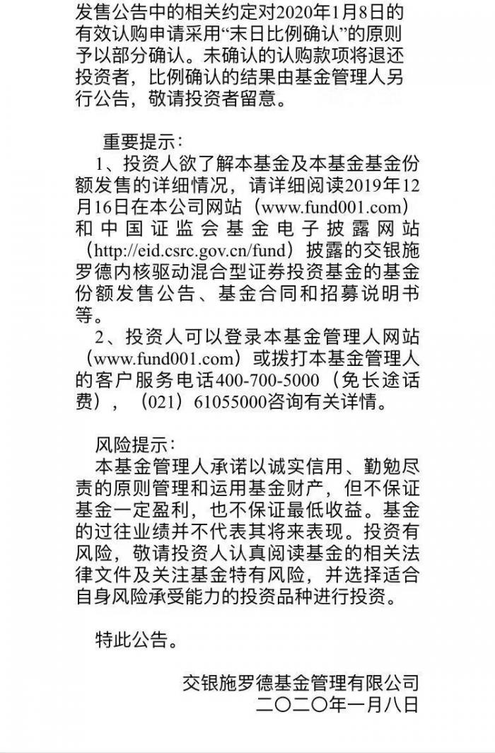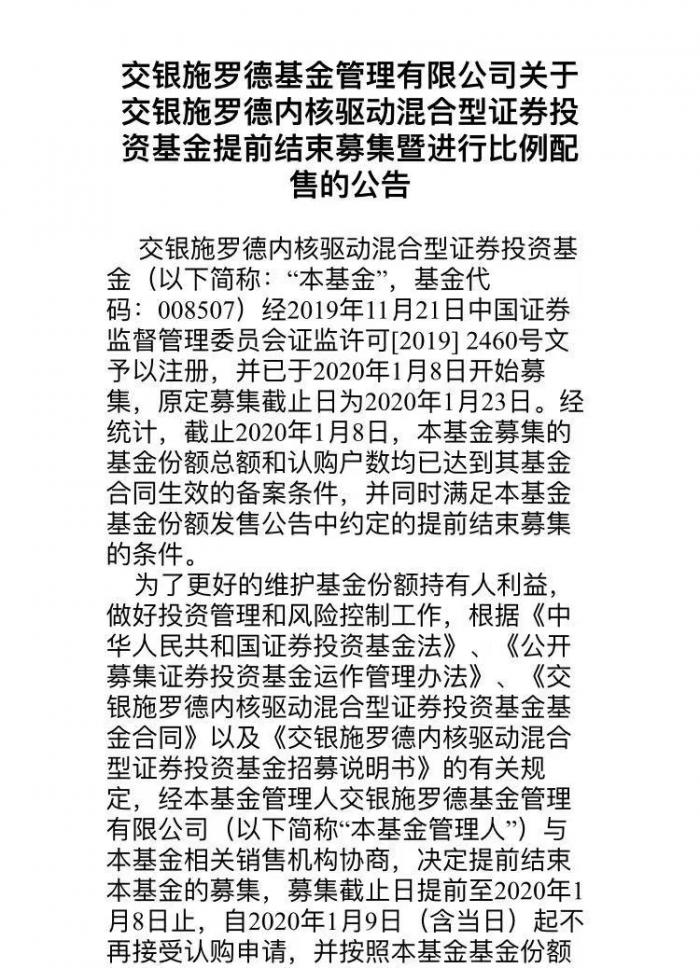 当天晚上,交银施罗德官网公布《关于交银施罗德内核驱动混合型证券投资基金提前结束募集暨进行比例配售的公告》。