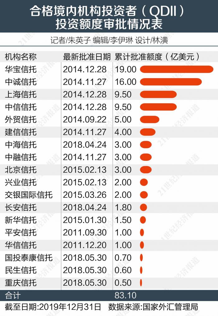 截至2019年末,18家信托公司累计获得总额度83.1亿美元,最近一次额度获批是2018年5月份。