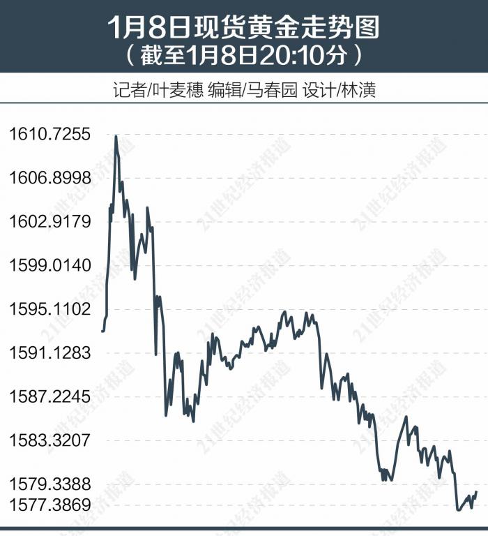 金融市场避险情绪大幅升温。黄金1月8日早盘快速冲上1600美元/盎司,随后冲至1610.9美元/盎司。不过在冲高之后出现跳水,一口气跌至1573美元/盎司才止步。从目前情况看,现货黄金仍是今年最硬核资产,短短几个交易日,已上涨超过4%。