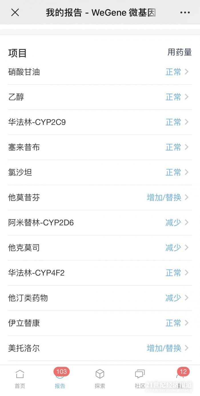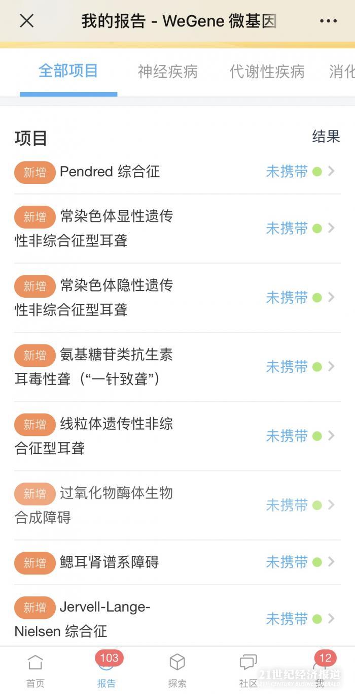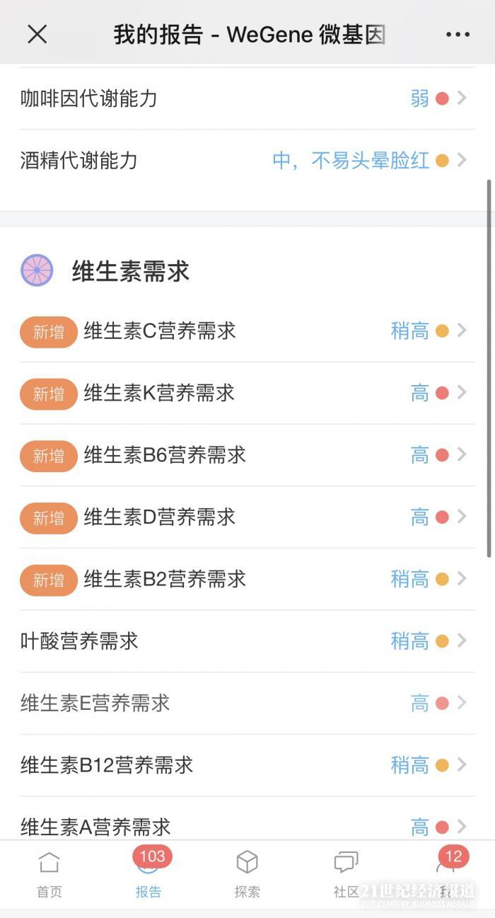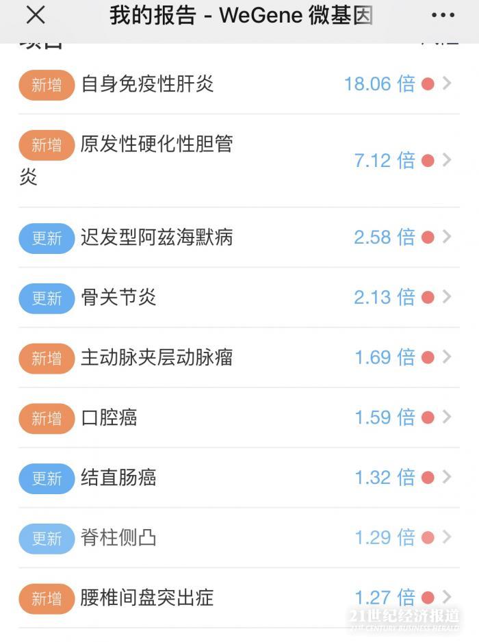 21新健康记者也购买了一份国内消费级基因检测公司微基因产品进行测试。以下为部分结果显示: