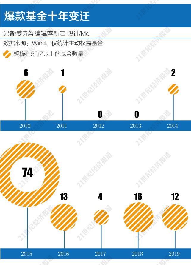 21世纪经济报道记者梳理数据发现,自2010年至2019年成立的主动权益类基金(包括普通股票型基金、偏股混合型基金、平衡混合型基金、灵活配置型基金),共有130只基金的发行规模超过了50亿元。