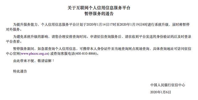 值得注意的是,在1月6日央行征信中心也发布公告称:“为提升服务能力,个人信用信息服务平台计划于2020年1月14日17时至2020年1月19日8时进行系统升级,届时将暂停对外服务。”暂停服务期间,如急需查询个人信用信息,可携带本人身份证件至当地查询网点现场查询。