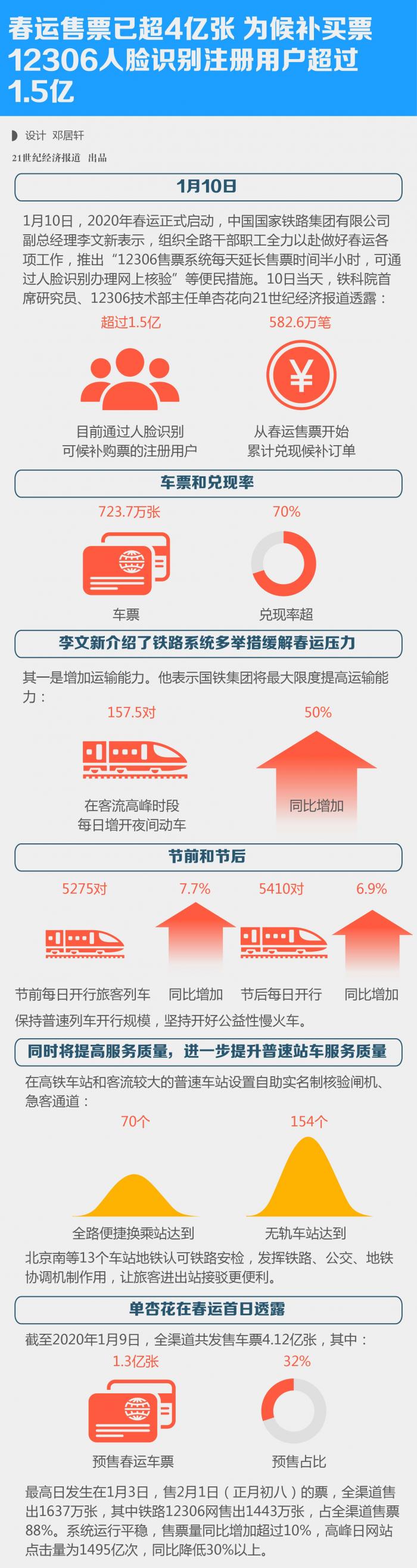 1月10日,2020年春运正式启动,中国国家铁路集团有限公司副总经理李文新表示,组织全路干部职工全力以赴做好春运各项工作,推出“12306售票系统每天延长售票时间半小时,可通过人脸识别办理网上核验”等便民措施。10日当天,铁科院首席研究员、12306技术部主任单杏花向21世纪经济报道透露,目前通过人脸识别可候补购票的注册用户超过1.5亿,从春运售票开始,累计兑现候补订单582.6万笔,车票723.7万张,兑现率超70%。
