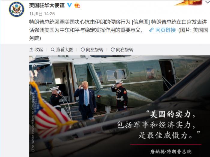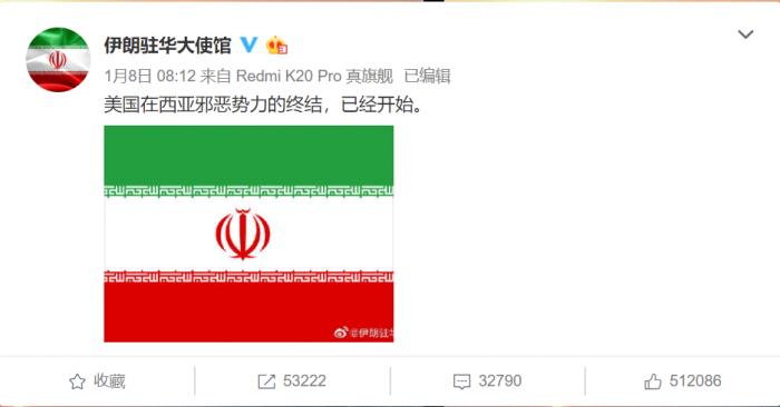 1月8日,伊朗驻华大使馆在官方微博上写道“美国在西亚邪恶势力的终结,已经开始”,并连发数条微博,比如“如果美国对此报复,必将得到最强报复”,“伊朗针对目标采取并完成了相应的自卫措施,以回应对我国公民和高级官员发动的怯懦军事攻击”,“他们今天被打了一记耳光,但这样的军事行动还不够”。