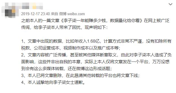 据微念科技相关人士介绍,早在2019年12月17日晚,发布上述文章的博主,已经针对对李子柒收入数据的不实报道,在微博发布道歉声明,并表示,计算方式不严谨,没有扣除所有税款、公司运营成本、视频制作成本和推广成本。