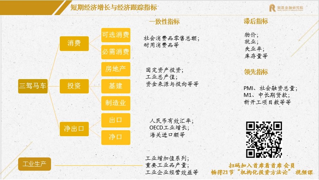 接着,我们来说下经济增长。从支出法来看,GDP的动力有三架马车,分别是消费、投资和出口。其中,消费可分为必需消费和可选消费,具体的再细分,大家顾名思义就行了,衣、食之类的就是必需消费,汽车、家电、化妆品等之类的就是可选消费。
