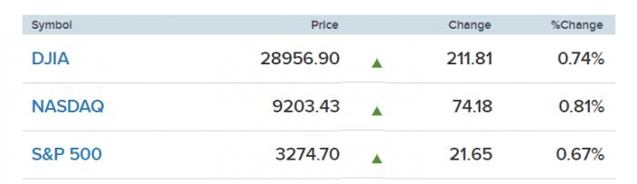 截至收盘,道琼斯工业平均指数上涨211.81点,涨幅0.74%,报28956.90点,距离29000点整数关口仅一步之遥。标准普尔500指数上涨0.67%至3274.70点,纳斯达克综合指数上涨0.81%至9203.43点。