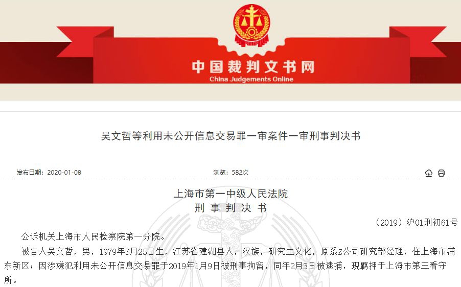 最终,吴文哲犯利用未公开信息交易罪,被判处有期徒刑一年,并处罚金人民币五万元。刑期自2019年1月9日起至2020年1月8日止。侯宇洁犯也被判处有期徒刑一年,并处罚金人民币五万元,刑期和昔日爱侣一样。