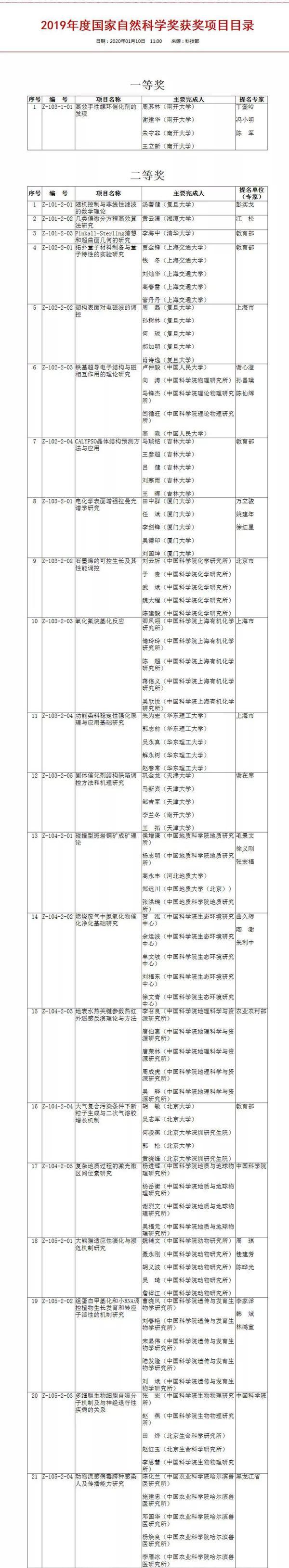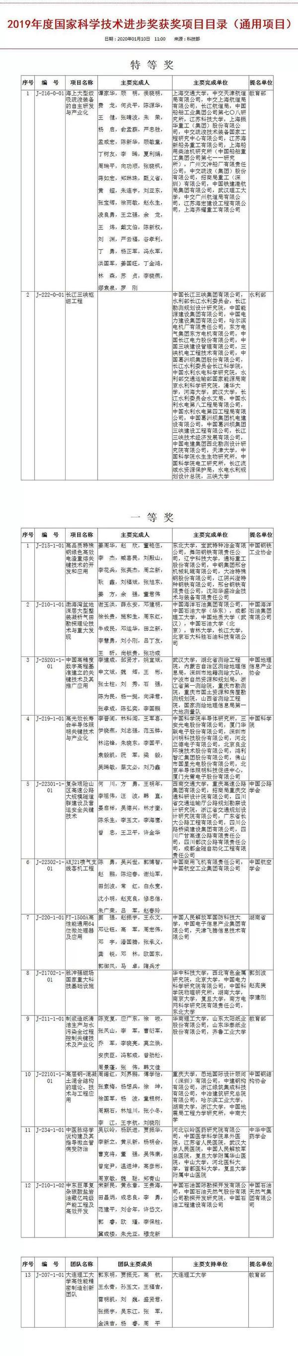 在1月10日的国家科学技术奖励大会上,国务院共评选出296个项目和12名科技专家,批准授予国家自然科学奖项目46项,国家技术发明奖项目65项,国家科学技术进步奖项目185项,授予10名外籍专家中华人民共和国国际科学技术合作奖。中国第一代核潜艇总设计师黄旭华院士、中国科学院大气物理研究所研究员曾庆存院士,获2019年度国家最高科学技术奖。长江三峡枢纽工程、阿里云等项目入选国家科技进步奖。
