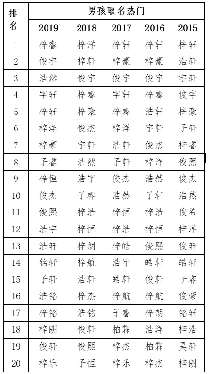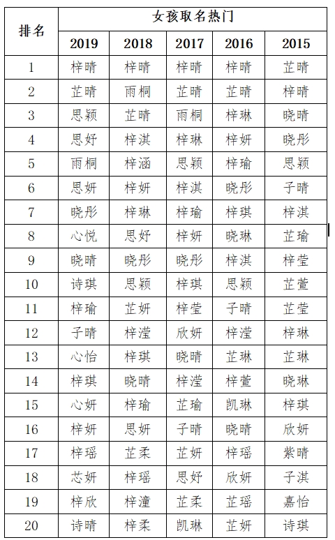 2019年在佛山办理出生登记的人口中,大约1000个男孩中,有2个取名为“梓睿”。女孩取得最多的名字是“梓晴”,已连续4年排行榜首,1000个女孩中有4个叫“梓晴”。