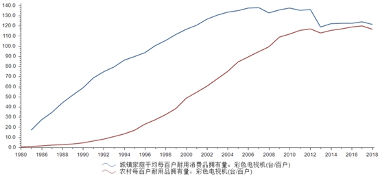 对于电视机一百多年的辉煌历史,“重回客厅”的这个词略显委屈。过去,无论全球哪里,电视机都是客厅的座上宾,甚至成为家庭财富的象征。老杨想起了小时候,村里有人买了一台21吋的彩色电视机,全村的小伙伴天天聚集在他家里看香港武打片的场景。而在2010年左右,电视行业的窘境来的很急促。这种窘境与忽如其来的移动互联网密不可分。国家统计局数据显示,中国城镇居民在2005年前后达到每百户130台的峰值后便不再增长,而农村居民也在2011年达到高峰。最近几年,全国家庭户均拥有量停滞不前,甚至略微下降。