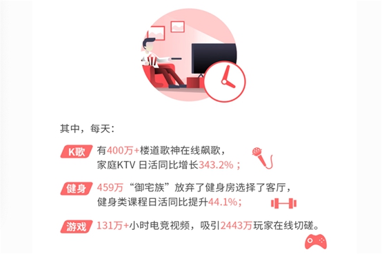 1月9日,海信发布的《2019海信互联网电视白皮书》显示,“低头族”正重回客厅。2019年家庭互联网电视日均在线时长达334分钟,接近手机使用时长;累计点播502.44亿次,点播量同比增长12.6%。看电视正变成“玩电视”,K歌、健身、游戏乃至学习培训等应用场景都在通过电视完成。一开始,老杨对于这一数据是将信将疑。便咨询了一位早已成家立业的老同学,电视似乎成为他们日常生活不可缺少的一部分,甚至发挥非常重要的作用。两岁半的孩子天天在电视上玩游戏、学英语,周末陪着孩子对着电视机学习健美操。另一位好朋友也说他们经常周末在家用电视机K歌。海信的数据也在印证老杨交流得到的这些信息。2019年,大屏K歌活跃家庭为400万,家庭KTV日活同比增长343.2%;以AI识别为方向的大屏健身,日活家庭达到了459万,增长44.1%;电视游戏频道活跃用户已经超过了2443万。