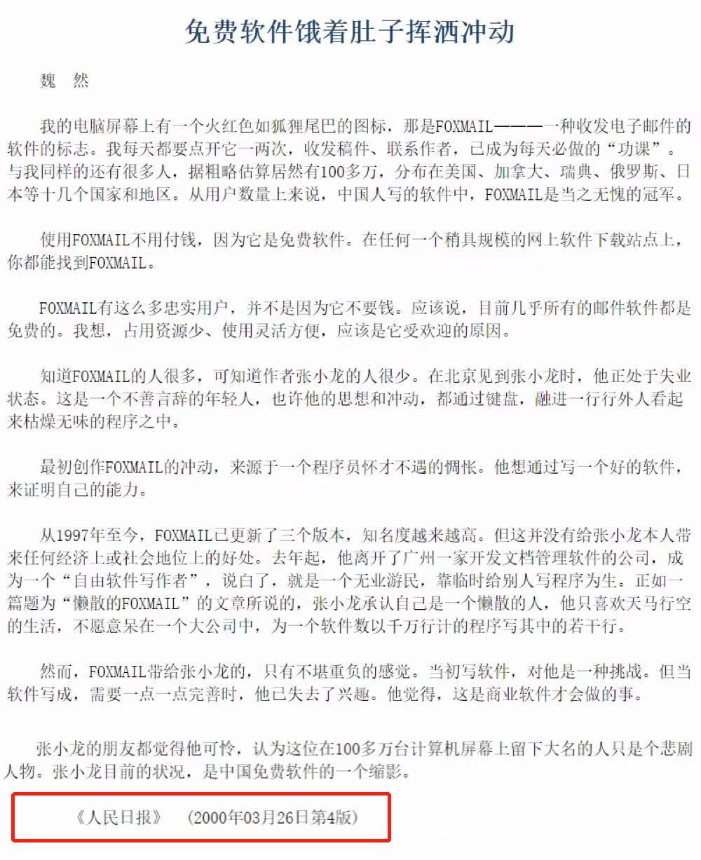 当年,人民日报一个叫魏然的记者采访了他,而后在2000年3月26日,《人民日报》发表了一篇题目为《免费软件饿着肚子挥洒冲动》,现在还能找到。