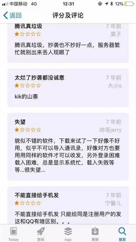 七年前,许多用户在微信 iOS 版的页面上给微信打了一星,并评论道:“它不能像飞信那样给电话号码发消息,也没有 QQ 的功能,那要这个应用有什么用?”