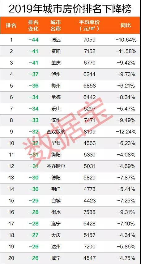 随着房价的此消彼长,一些城市的排位也出现较大跌幅。其中,去年房价下跌10.64%的清远,从2018年底的108位跌至去年底的152位,排名下降44位。去年房价下跌11.58%的资阳,从2018年底的102位跌至去年底的143位,排名下降41位。另外,肇庆、泸州、梅州等10个城市排名下降30位以上。