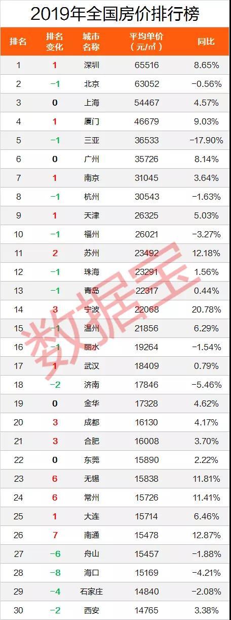 2019年全国房价前十的城市和2018年没有发生变化,依然是深圳、北京、上海、厦门、三亚、广州、南京、杭州、天津、福州。其中,厦门从2018年的第五升至去年的第四;南京从第八升至第七;天津从第十升至第九。三亚从第四降至第五;杭州从第七降至第八;福州从第九降至第十。