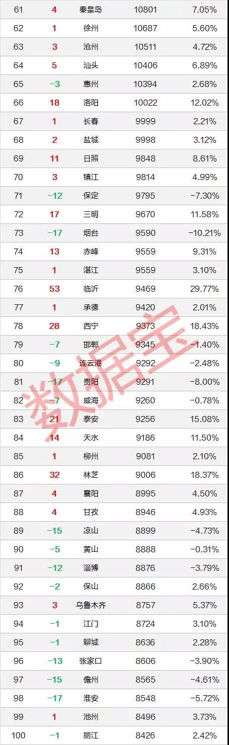 临沂、林芝、西宁、泰安等4个城市新晋房价百强榜。其中,临沂从2018年的129位升至76位,暴涨53位。林芝从118位升至86位;西宁从106位升至78位;泰安从104位升至83位。唐山、南宁两个城市新晋房价50强榜。唐山从61位升至42位;南宁从52位升至46位。南通新晋30强榜,从33位升至26位。