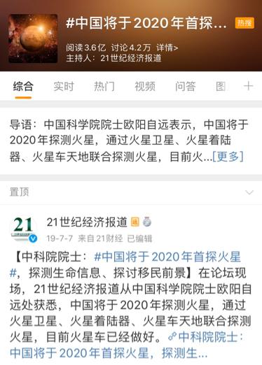 我们始终奔跑于新闻前线,争取带来迅速、独家的消息。2019年7月,21世纪经济报道记者现场获悉“中国将于2020年探测火星”后,在业内首发该报道。21君第一时间发布微博,创造话题#中国将于2020首探火星#,讨论数高达4.2万,阅读数为3.5亿。