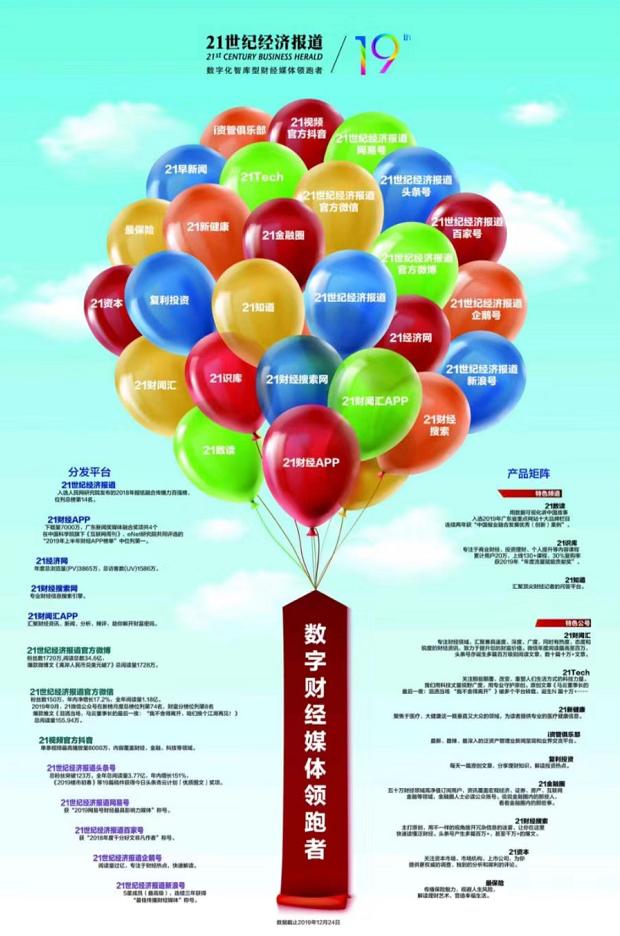 作为南方财经全媒体集团的旗舰媒体,21世纪经济报道已成功实现全媒体平台整合运营,形成以21财经APP 、21经济网、21世纪经济报道微信、21世纪经济报道微博及各订阅号组成的融媒体矩阵,是当前中国财经新闻领域最具影响力的媒体平台之一。其中,21财经APP下载量已超过7020万,月活900万。