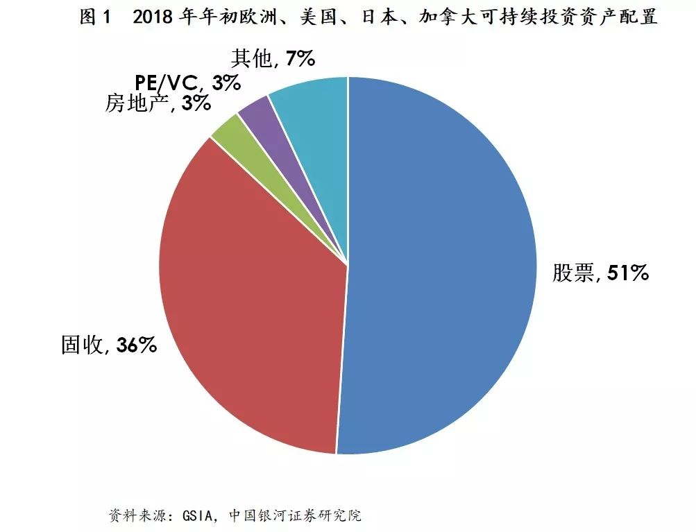根据GSIA的统计,2018年初,全球进行可持续投资的国家(欧洲、美国、日本、加拿大、澳大利亚和新西兰)的投资规模超过30万亿美元,两年内增长了34%,如表2所示。可持续投资重点配置为上市公司股票(51%)、固定收益证券(36%),少量投资于房地产(3%)和私人股权(PE)/风险投资(VC)(3%),如图1所示。