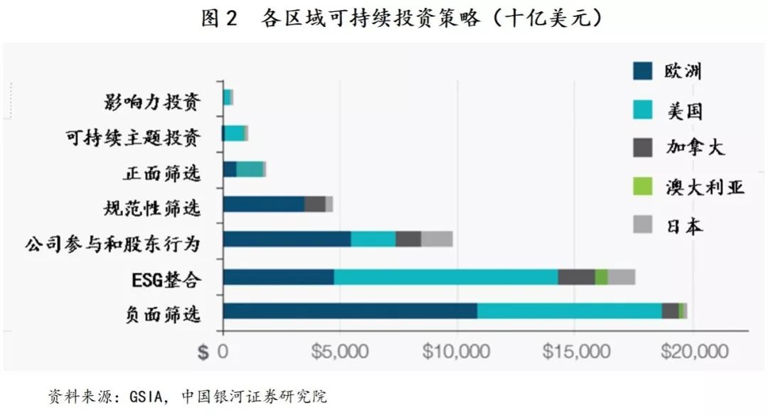 全球最常采用的可持续投资策略是负面筛选策略,投资规模约19.8万亿美元;其次是ESG整合策略,投资规模为17.5万亿美元。负面筛选主要集中在欧洲,ESG整合主要集中在美国。日本主要采用ESG整合以及公司参与和股东行为策略,如图2所示。