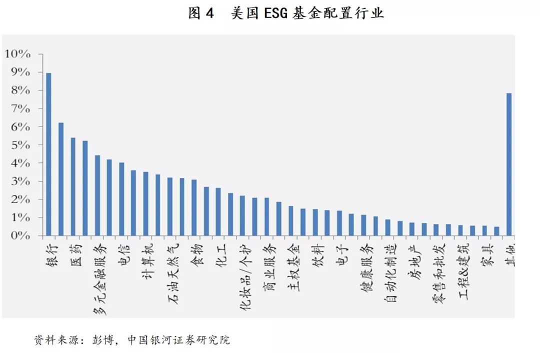 美国ESG基金重点配置科技(19.72%)、金融(17%)、医疗健康和消费领域,投资的细分领域主要是银行(8.96%)、互联网(6.21%)、医药(5.39%)、软件(5.24%)、多元金融服务(4.42%)、零售(4.2%)、电信(4.04%)、保险(3.59%)、计算机(3.53%)、半导体(3.37%)、石油天然气(3.21%)、健康产品(3.18%)等领域,如图4所示。