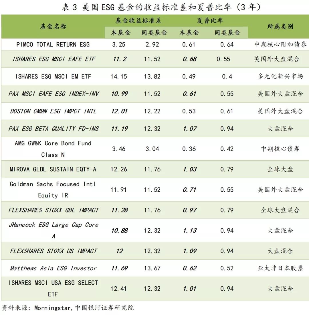 多数采用ESG投资策略的基金可以获得比同类基金较高的夏普比率,同时收益较为稳定。截止2019年10月底,79支中管理资金规模超过5,000万美元的ESG基金共有43支,其中14只基金有可比基金类别。10只基金的夏普比率高于同期同类别基金,8只基金的收益标准差小于同类基金,如表3所示。