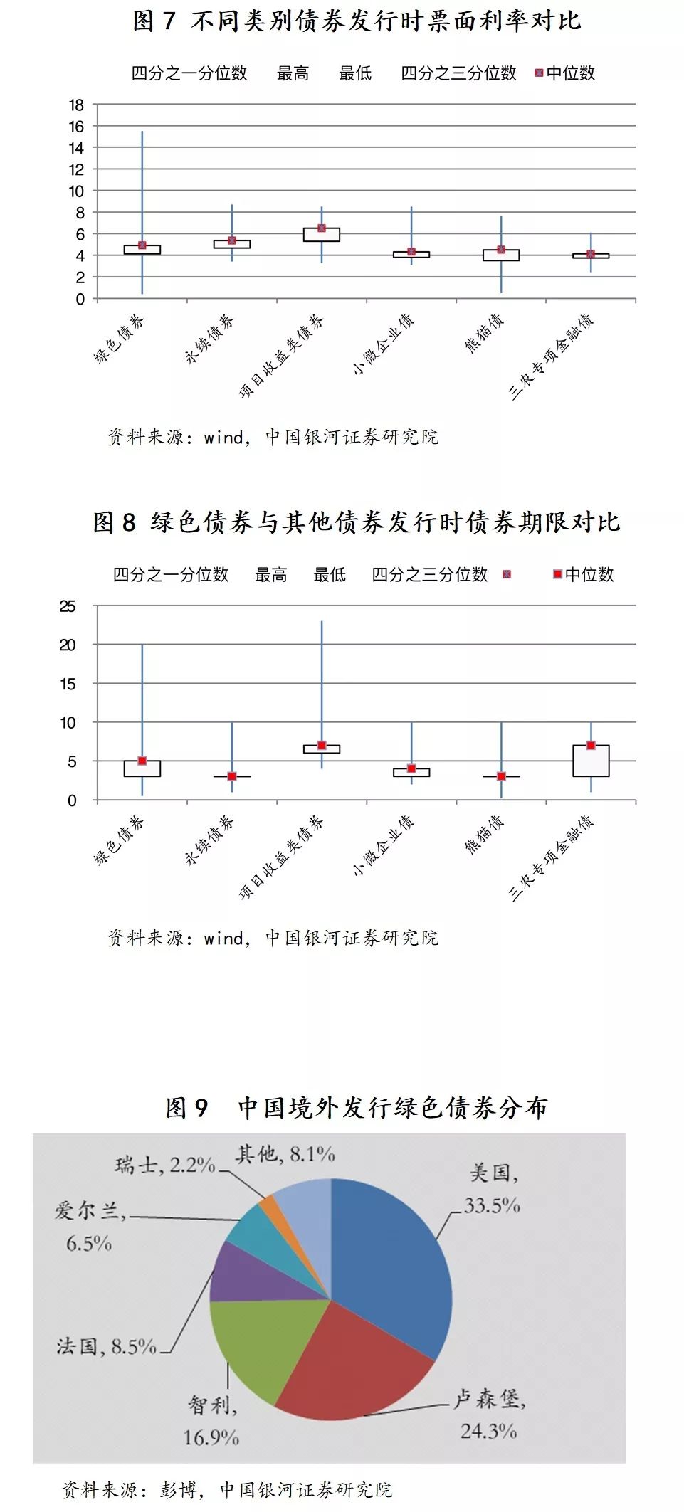 截止2019年11月底,中国境内共发行人民币绿色债券共有438支,合计发行总额4906.7亿元人民币。与其他债券相比,绿色债券发行时的票面利率范围广,其中位数高于小微企业债和专项金融债,比永续债券和项目收益类债券低,如图7所示;绿色债券的期限相对较长,仅短于项目收益类债券和三农专项债券,如图8所示。境外共发行49支绿色债券,其中,包含14支人民币绿色债券,合计993亿元;12支欧元绿色债券,合计69亿欧元;21支美元绿色债券,合计132.5亿美元;1支港元绿色债券,26亿港元;1支日元绿色债券,发行规模300亿日元。中国绿色债券境外主要持有占比最多的是美国(33.5%),其次是卢森堡(24.3%)、智利(16.9%)、法国(8.5%)、爱尔兰(6.5%)等,如图9所示。