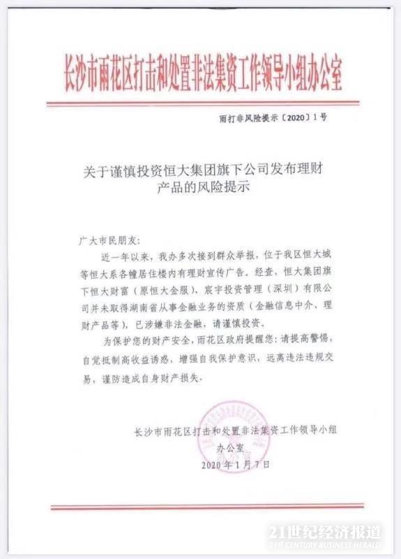 2020年1月7日,一则消息在网络上传开,长沙市雨花区打击和处置非法集资工作领导小组办公室发布风险提示,称恒大集团旗下恒大财富(恒大金服)、宸宇投资管理(深圳)有限公司未取得湖南省从事金融业务的资质(金融信息中介、理财产品等)、已涉嫌非法金融,请谨慎投资。