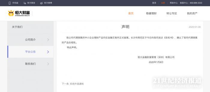 在“恒大财富”官网上,1月8日贴出了一则公告称:“我公司代理销售的中小企业理财产品均在金融交易所正式备案。长沙市雨花区于今日向我司送达《告知书》,确认了我司代理销售的产品合规性。”