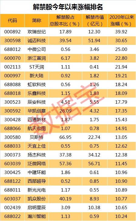 华为概念股诚迈科技收获两连板,最新价再创历史新高,今年以来涨幅达到30.65%。1月20日诚迈科技将有0.32亿股解禁,占总股本比例的39.54%,解禁市值51.94亿元。此外,中微公司、浙江富润、ST天润累计涨幅也在20%以上。