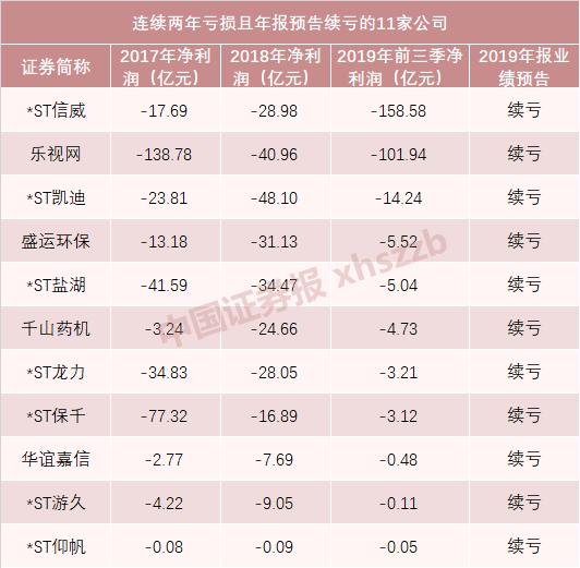 wind数据显示,此前连续两年亏损且2019年年报预告续亏的个股,目前共有11只,包括7只*ST股票和4只创业板股票。这意味着,它们存在显著的退市风险。