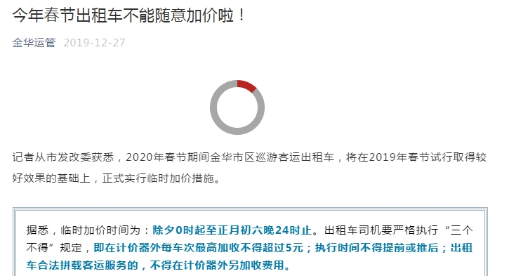 金华市区将在2020年春节期间正式实行临时加价措施。在计价器外每车次最高加收不得超过5元。执行时间不得提前或推后,出租车合法拼载客运服务的,不得在计价器外另加收费用。