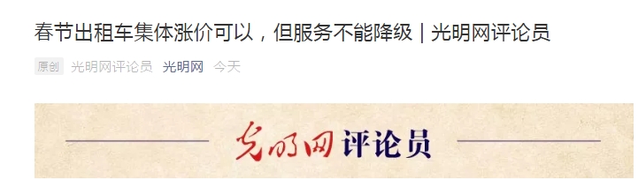 1月11日。光明网微信发表评论员文章称,以浮动价格的方式,鼓励司机春节坚持上岗,也让他们更有动力提供优质的服务,这种“明目张胆”的涨价,并非难以接受。