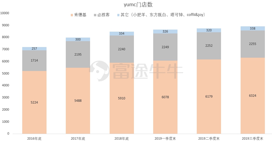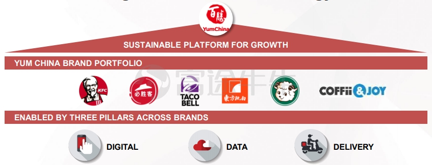 2016年,百胜中国(YUMC.US)从百胜餐饮集团(YUM.US)中分拆后独立在纽交所上市,百胜中国拥有肯德基、必胜客、东方既白、小肥羊和Taco Bell品牌在国内的经营权和加盟管理权。