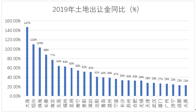 虽然大连领涨,但2019年土地出让金并不高,315亿在全国50城样本城市中垫底。