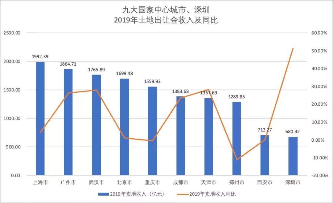 不过,年轻的深圳,也面临教育、医疗“补课”的压力,经济增速有所放缓。2019年的卖地收入,也创下了51.46%的高速增长。